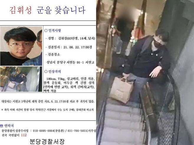 경기도 성남시 분당구에서 서현고등학교 3학년 김휘성 군이 엿새째 실종돼 경찰이 수색을 이어가고 있습니다.